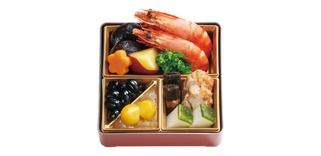 ①つの字海老=2尾 ②どんこしいたけ=2個 ③梅人参=1枚 ④金時芋蜜煮=1個 ⑤菜の花=1枝 ⑥黒豆=25g ⑦栗甘露煮=2切 ⑧金時芋金団=40g ⑨一口昆布巻=2本 ⑩阿波すたち鶏の鍬焼=2枚 ⑪養老羹磯部流し=2枚