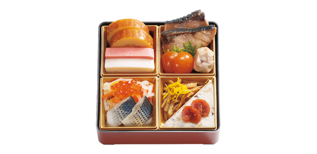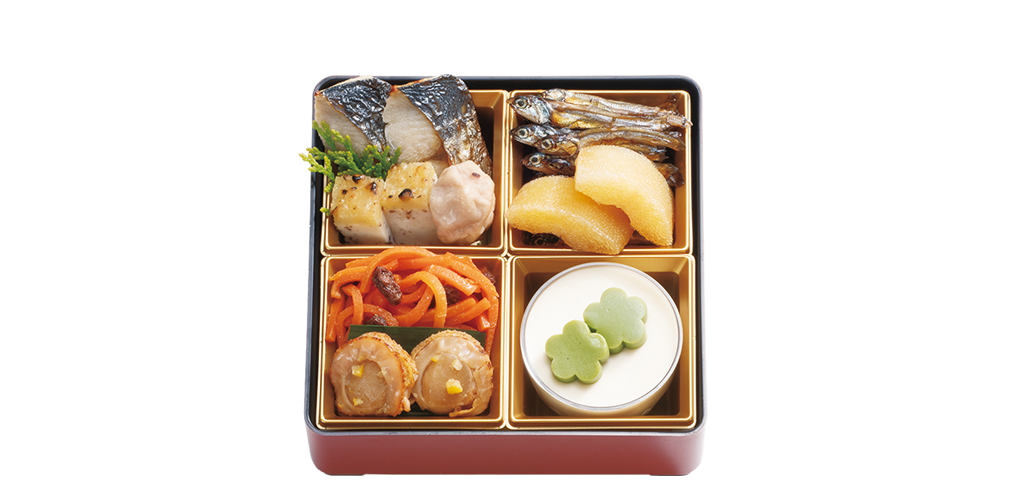 栗きんとん、焼き筍うま煮、椎茸旨煮、人参旨煮、きぬさや、蛸のバジルソース、ぶどう豆、ローズサーモン、伊予柑紅白生酢、さより京風巻き、にしん昆布巻き、若桃シロップ煮、鰤照り焼き、杉板包み